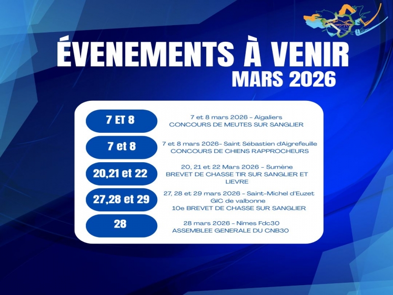 7 et 8 mars 2026 - Aigaliers CONCOURS DE MEUTES SUR SANGLIER CEZ Bertrand /06.62.26.46.70 7 et 8 mars 2026- Saint Sébastien d'Aigrefeuille CONCOURS DE CHIENS RAPPROCHEURS 06 13 41 13 04 20, 21 et 22 Mars 2026 - Sum...