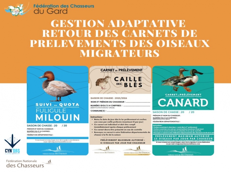 Au 1er Juillet 2025, de nouvelles modalités sont venues s’appliquer aux chasseurs d’oiseaux migrateurs dans le cadre de l’application de la gestion adaptive sur les Anatidés (sauf Canard Colvert), le Fuligule Milouin e...
